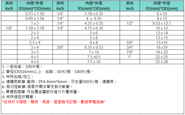 耐高/低溫、耐強酸鹼、抗沾黏、高耐化性,屬使用成本低,效能高的通用型管件。 PTFE TUBE/鐵氟龍管/PTFE鐵氟龍軟管/ PTFE鐵氟龍彩色管/PTFE鐵氟龍彩條管/ PTFE鐵氟龍裁切管